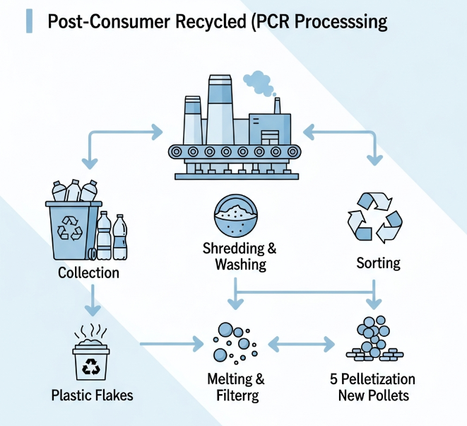 Definição: O material PCR é derivado exclusivamente de produtos que foram utilizados pelos consumidores finais, recolhidos através de programas de reciclagem estabelecidos e desviados de aterros sanitários ou oceanos. Isso inclui itens de uso diário, como garrafas plásticas de água usadas, recipientes de iogurte, jarras de detergente e latas de alumínio.