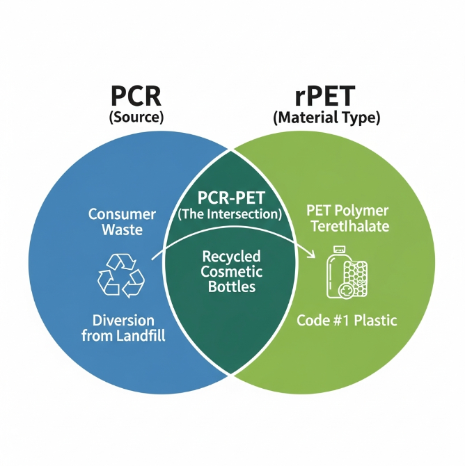 A diferença entre um frasco de cosmético PCR e um frasco de cosmético rPET é de escopo e origem. O termo rPET é uma descrição técnica da identidade química do plástico, enquanto o PCR é o padrão ouro para definir sua origem ética.